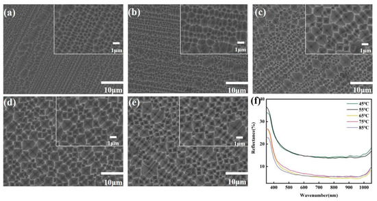Effect of etching temperature on etched Si surface morphology: (a) 45 °C; (b) 55 °C; (c) 65 °C; (d) 75 °C; (e) 85 °C and corresponding reflectance spectrum (f).
