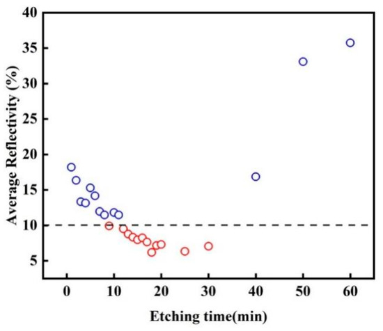 The effect of time on the etching results is shown in Figure 8. It is obvious that the average reflectivity of Si wafers first decreased and then increased with prolonging etching time. The reflectivity of samples etched for 10–30 min was lower than 10%. Combing with the above experiment results, we considered that 0.6 M H2O2 was most beneficial for the inverted pyramid texturing process. With the above parameter conditions at this moment, NH4HF2 concentration (Figure 3) and temperature changes (Figure 7f) had little effect on the surface reflectivity after etching.