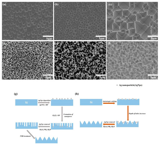 We compared the inverted pyramid formation process of NSR treatment and Ag@PVP–ACE, as shown in Figure 9. As for the fabrication process of inverted pyramids in Ag@PVP–ACE, first, shallow inverted pyramid grooves appeared locally on the Si surface via anisotropic etching (Figure 9a), then dense inverted pyramid grooves distributed randomly on the Si surface (Figure 9b). As the etching process continued, large-sized inverted pyramid holes emerged (Figure 9c). Completely different from Ag@PVP–ACE was that many nanopores needed to be manufactured on the Si surface first, before NSR treatment (Figure 9d). During the NSR treatment, nanopores expanded (Figure 9e) and then inverted pyramid formed via anisotropic etching (Figure 9f). The above results are consistent with the phenomenon in Figure 8. What was completely different from NSR technology was that the surface reflectivity decreased from high to low at the initial etching stage (0–15 min) of Ag@PVP–ACE. However, the reflectivity of Si treated by NSR technology would first decrease and then increase. Due to the difference in etching behavior in NSR and Ag@PVP–ACE, the appearance of many nanopores resulted in low surface reflectivity at the beginning of the texturing process. Afterward, the formation of a large-sized inverted pyramid structure via anisotropic etching increased the surface reflectivity in the NSR process (Figure 9g). As for the Ag@PVP–ACE technology, nanopores were replaced by shallow inverted pyramid square grooves on the Si surface. The relatively smooth surface resulted in higher surface reflectivity at the beginning of the etching process. Subsequently, the depth and distribution density of many inverted pyramid structures whose increased, and the inverted pyramid grooves transformed to inverted pyramid pores, which resulted in a gradual decrease in reflectivity (Figure 9h).