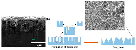 Cross-sectional SEM images of nanopores (a) and schematic diagram of nanopores treated by NSR process (b,c).