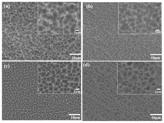 The samples treated in 0.875 M NH4HF2-Ag@PVP–ACE with different H2O2 concentrations are shown in Figure 6. Large-scale inverted pyramid randomly distributed on the Si surface when H2O2 concentration was 0.3–0.6 M (Figure 6a,b), and inverted pyramid structure became shallow as H2O2 concentration increase to 1.2–1.5 M (Figure 6c,d). The above experimental results indicated that excessive H2O2 concentration did not apply to the formation of an inverted pyramid, whose average reflectivity was difficult to reduce effectively to less than 10% (Figure 3). As mentioned before, the increase of NH4HF2 concentration accelerated the formation of pores. However, there was a certain balance between oxidation rate and etching rate. The appearance of a shallow inverted pyramid was caused by an intense oxidation process and low SiO2 etching rate.