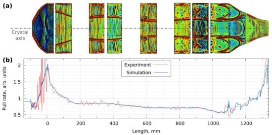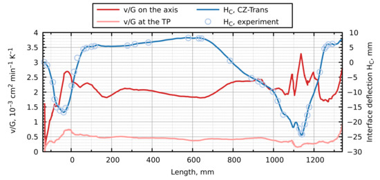 Besides the interface deflection, the whole interface shape should be correct as it affects the temperature gradient, thermal stress and PD distribution. The comparison to the experimental data plotted in Figure 3 confirms the good agreement. Since the calculated interfaces are plotted at regular intervals, one can visually estimate v and, e.g., verify that v at the beginning of the body phase is higher than at the end. Although the difference in v between the crystal center and TP is harder to see with the naked eye, it is noticeable during shouldering ().