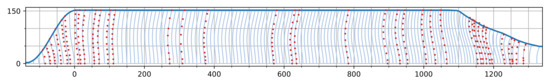 Compilation of the calculated crystallization interface shapes plotted each 20 min. Also shown are the interfaces manually extracted from the experimental measurements (red dots). Dimensions are given in millimeters.