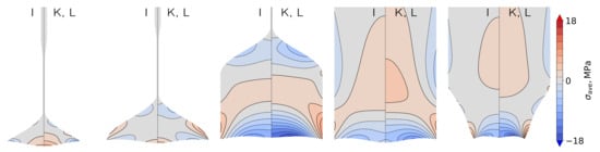 Mean thermal stress (negative–compressive stresses shown with dashed isolines) for parameter sets I (left side), K and L (right side). In reading order: cone (mm); shouldering (0 mm); body phase (200 mm); body phase (1000 mm); endcone (1250 mm).