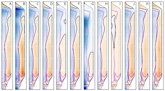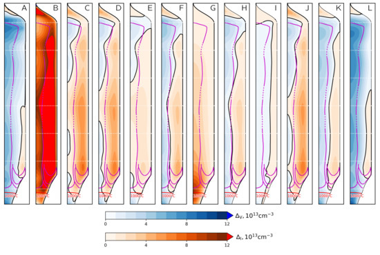 Comparison of PD distributions with experimental IVB (solid magenta curves—measurements, dashed lines—interpolation) for original PD parameter sets (A–L). Solid black curve—, red curve— below which PD are frozen-in, dotted white lines for length reference are plotted every 200 mm starting from .