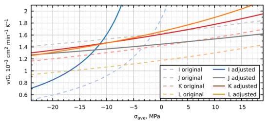 The thermal stress influence is crucial for the correct prediction of the IVB, as can be seen by comparing set pairs C & J, and H & K. As was already observed for the original PD parameters, the IVB becomes straighter, which is in a better agreement with experiment. A worse performance of set J, compared to K and L, is most likely due to weaker stress parameters, see Table 3 and Figure 4. We believe that adjustment of can further improve agreement with the experiment, but such investigation is beyond the scope of this paper.