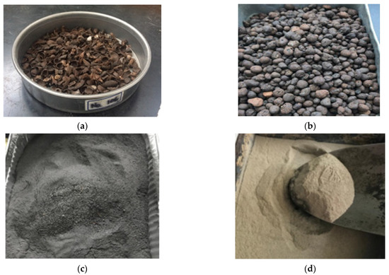 The materials in concrete casting: (a) OPS, (b) LECA, (c) G-POFA, and (d) U-POFA.