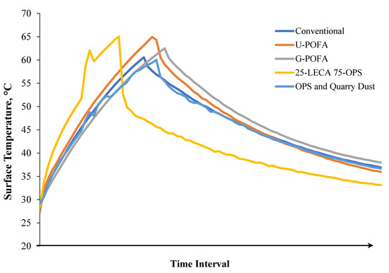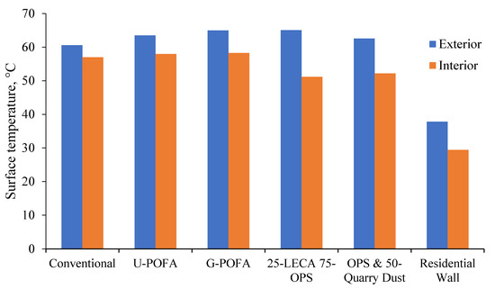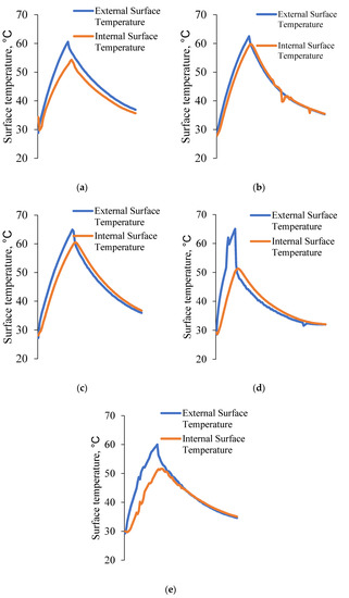 The external and internal surface temperatures for (a) conventional; (b) U-POFA; (c) G-POFA; (d) 25-LECA 75-OPS; and, (e) OPS 50-Quarry Dust.