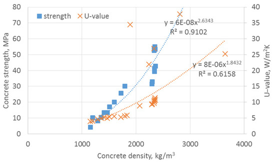 According to MS1525 [25], the wall OTTV value of commercial building of 4000 m2 and above should be controlled at around 50 W/m2. The plastered walls shown in Table 4 passed the requirement, while unplastered concrete walls did not pass the requirement using 102 mm wall thickness. In order to achieve 17 MPa of structural concrete, unplastered structural concrete wall is insufficient for providing thermal protection from this envelope, as it is almost reached 80 W/m2 OTTV value. Figure 9 shows the correlation of concrete density, concrete strength, and U-value. As a summary, by combining the regression lines in Figure 9, the correlation can be represented by Equation (5).