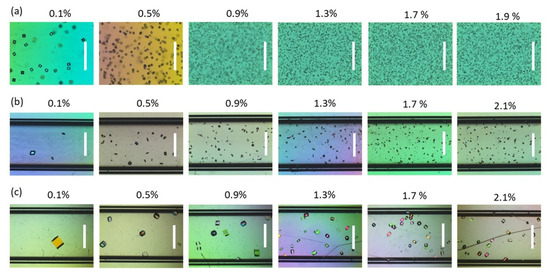 Flat capillaries containing (a) proteinase K, (b) insulin, and (c) HEWL crystals obtained with increasing concentrations of agarose. The scale bar is 250 µm for the proteinase K series and 500 µm elsewhere.