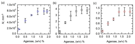 The nucleation density, N, as a function of the agarose concentration for (a) proteinase K, (b) insulin, and (c) HEWL. Error bars refer to the standard deviation.
