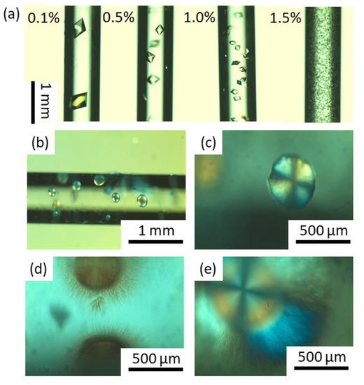 (a) Proteinase K crystals grown inside capillaries loaded with 0.1, 0.5, 1.0, and 1.5% (w/v) agarose gels under FID conditions. The protein concentration was 25 mg/mL in 50 mM HEPES pH 7.0, and 3 M (NH4)2SO4 in 0.1 M Tris pH 8.0 was employed as a precipitant solution. (b) Proteinase K crystals grown inside capillaries loaded with 0.5% (w/v) agarose gels under FID conditions. The protein concentration was 15 mg/mL in 50 mM HEPES pH 7.0, and 2.5 M (NH4)2SO4 in 0.1 M Tris pH 8.0 was employed as a precipitant solution. Enlarged images of crystals grown near the interface with the precipitant solution, in the middle, and at the end of the capillary are reported in (c), (d), and (e), respectively.
