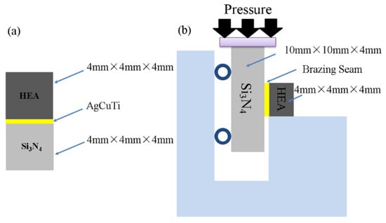 Si3N4 ceramic (provided by Beijing Kaifa Special Ceramics Co., Ltd. Bijing, China) was used as the matrix material in the experiment. The raw materials for preparing TiZrHfNbMo include Ti, Zr, HF, Nb and Mo. The purity of TiZrHfNbMo metal is higher than 99.9%. TiZrHfNbMo is a body centered cubic (BCC) solid solution alloy ingot prepared by arc melting in a water-cooled copper crucible repeated five times. The high-entropy alloy was cut into blocks (4 mm × 4 mm × 4 mm). The size of the Si3N4 ceramic sample used for the shear strength test was 10 mm × 10 mm × 4 mm, and the size used for OM (optical microscopy) was 4 mm × 4 mm × 4 mm.