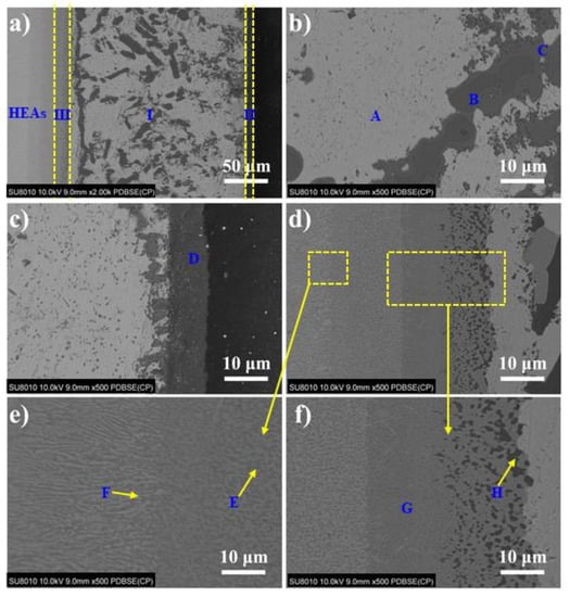 (3) Zone III: combined with Figure 4c, it can be found that a large number of Cu elements are concentrated in the high-entropy alloy side during brazing. However, as the high-entropy alloy in this work belongs to the refractory high-entropy alloy, the hysteresis diffusion effect and brazing temperature of the high-entropy alloy are far lower than its melting point, so there is no obvious diffusion of elements in the base metal side of high-entropy alloy. However, the Cu element in the filler diffuses into the high-entropy alloy to replace Zr element, and a new solid solution phase TiCu(Hf,Zr)NbMo is formed. At the same time, more Cu and Ti elements diffuse to the high-entropy alloy side and form Cu4Ti phase in the zone I: