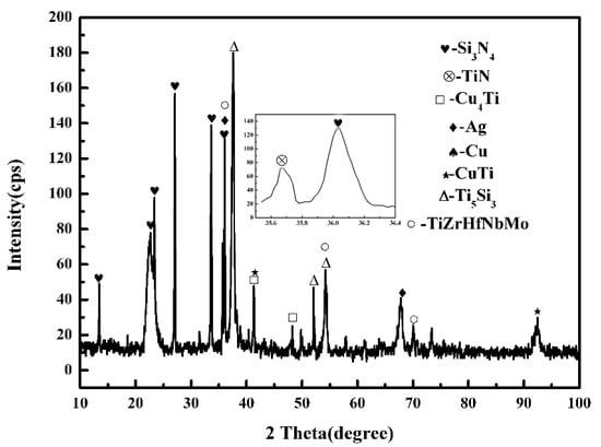Figure 2 shows the typical microstructure of TiZrHfNbMo high-entropy alloy/AgCuTi/Si3N4 joint brazed at 840 °C for 60 min. It can be seen from the figure that the joint is well connected, and there are no cracks, pores and other defects in the weld. The whole interface of the joint is divided into three areas, which are marked as zone I, zone II and zone III (as shown in Figure 2a). In order to study the interface microstructure of the joint, EDS analysis was carried out on the typical microstructure (the characteristic phase is marked as A–G in Figure 2b–f), and the analysis results are shown in Table 1. EDS results show that the gray A phase is rich in Ag, which means that an Ag-based solid solution (Ag (s, s)) was formed in the joint. The gray phase B is Cu (s, s) [22,23]. The dark gray C phase surrounded by B phase is mainly composed of Cu and Ti, and its atomic ratio is about 1:1, so the dark gray phase C is CuTi phase. In region III, the dark gray D phase is mainly composed of Cu, Ti and Si, and the atomic ratio of elements is about Cu: Ti = 1:1, Ti:Si = 5:3. Therefore, it is inferred that the D phase is CuTi + Ti5Si3 [24]. In order to further study the interface microstructure of region I, the reaction layer structure region in Figure 2d is enlarged and shown in Figure 2e,f. It can be seen from Figure 2e that the dark phase E is composed of Cu and Ti, and its atomic ratio is close to Cu:Ti = 4:1. Based on the Cu-Ti binary phase diagram, it can be concluded that the E phase is Cu4Ti. The elements in phase F are Ti, Cu, Zr, HF, Nb and Mo, and the atomic ratio of Ti: Cu: (HF, Zr): NB: Mo is approximately 1:1:1:1. Therefore, it can be inferred that phase F is a solid solution phase TiCu(Hf,Zr)NbMo. The content of Cu in the G phase is 63.74 at.%, so the G phase is Cu (s, s). The H phase is composed of Cu and Ti, and its atomic ratio is close to 2:1, therefore, the H phase is Cu2Ti. The phase composition of the brazed joint is shown in Figure 3. It is further confirmed that the joint is composed of Ag (s, s), Cu (s, s), Cu2Ti, CuTi, Ti5Si3, TiZrHfNbMo, Cu4Ti [27]. The amount of the Cu2Ti is so small that it cannot be detected. Therefore, the interface structure of TiZrHfNbMo high-entropy alloy/Si3N4 joint is determined as TiZrHfNbMo high-entropy alloy/Cu4Ti + TiCu(Hf,Zr)NbMo/Cu2Ti + Ag(s, s) + Cu(s, s) + CuTi/Ti5Si3/Si3N4.