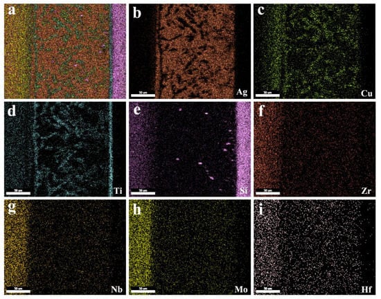 The typical cross section of the TiZrHfNbMo HEAS and Si3N4 ceramic joint brazed at 840 °C with AgCuTi filler is shown in Figure 4. It can be seen from Figure 4b–i that Ag, Cu, Ti, Si, Zr, Nb, Mo, and Hf are the main elements in brazed joint. Ag is mainly distributed in zone I, as can be seen in Figure 4b, as Ag is inert and has no obvious diffusion. According to Figure 4c, Cu is distributed in zone I and II. On the one hand, driven by the concentration gradient, the Cu element in the liquid filler diffuses to the zone I. On the other hand, it is because the residual Cu remains in zone II of brazing center due to the decrease of concentration.