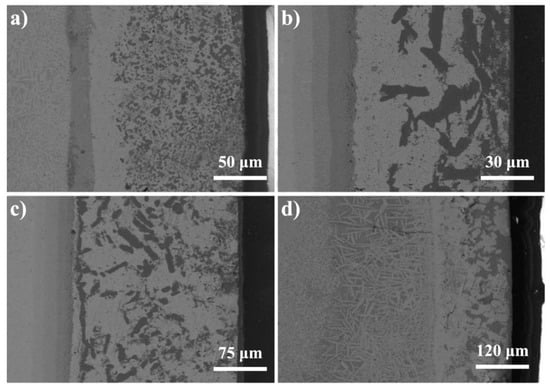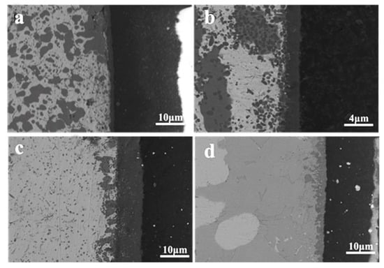 The backscattered images of joints brazed at different temperatures (a) 800 °C, (b) 820 °C, (c) 840 °C, (d) 860 °C.