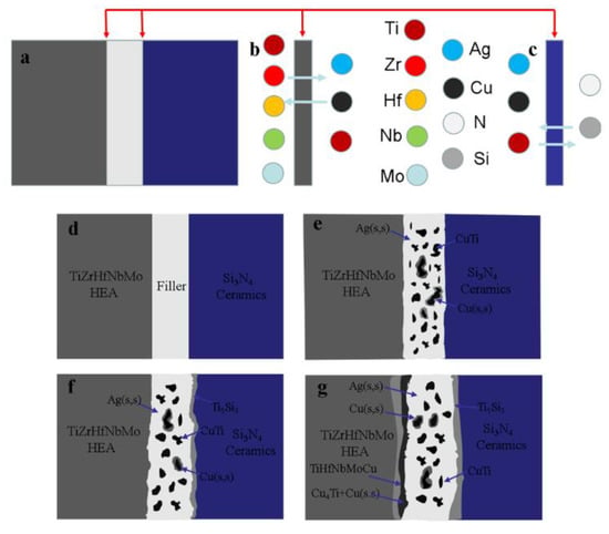 The mechanism of atom diffusion and reaction during brazing is shown in Figure 7. The initial state of brazing interface and the main atomic composition of brazing base metal and filler metal are shown in Figure 7a–c. At this stage, due to the low temperature, the AgCuTi filler does not melt, and there is no obvious atomic diffusion and chemical reaction at the interface. When the temperature reaches the melting point of the filler, the liquid filler begins to spread and wet the base metal, and the elements in the filler begin to diffuse to both sides of the substrates. During the brazing holding stage, the filler metal diffuses to the base metal rapidly, and the elements at the interface of the base metal also begin to diffuse slowly to the filler metal [29]. Finally, the base metal and filler are fully diffused and combined by metallurgical reaction to form a good joint. Figure 7e–g shows the interfacial reaction process and the formation mechanism of phases in the brazing process. More details are discussed as follows: