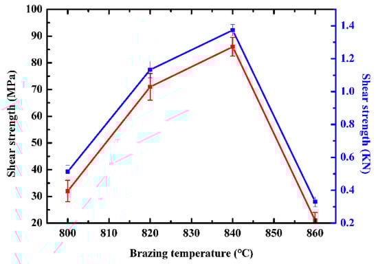 (3) When the brazing temperature is 800 °C, 820 °C, 840 °C and 860 °C, the shear strength of the joint is 30 MPa, 72 MPa, 86 MPa and 21 MPa, respectively.