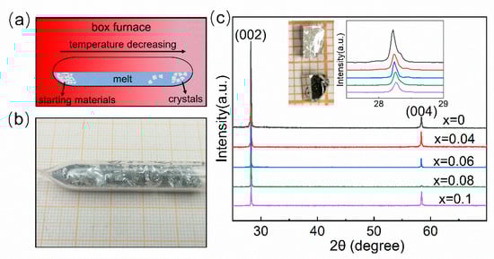 The liquid transport growth method [29] was successfully introduced to synthesize IST single crystals. In order to obtain high-quality single crystals, pretreatment of starting materials (elemental shots of indium (Alfa Aesar, 99.99%), tin (Alfa Aesar, 99.999%) and tellurium (Alfa Aesar, 99.999%)) was performed to remove possible oxide layers on their surface, as described in elsewhere [30,31]. To be specific, the above starting materials were sealed in a quartz tube (Jinghui, Lianyungang, Jiangsu, China), respectively, with hydrogen of 0.8 atm (atmosphere), and then they were annealed at a temperature 50 K lower than their melting point for 10 h. After that, mixtures of pretreated starting materials with the nominal composition of InxSn1−xTe (x = 0.04, 0.06, 0.08 and 0.1) were prepared with the total weight of 8.0 g and were sealed in evacuated quartz tubes (12 cm in length and 8 mm in inner diameter, with base pressure lower than 2 × 10−4 Pa). Then, the quartz tubes were placed horizontally in a muffle furnace (TMX-4-12, FNS Electric Furnace, Beijing, China) with a temperature gradient of 15 K. The furnace was heated to 1123 K in 10 h and kept for 48 h with intermittent shaking to ensure the homogeneity of the melt (or precursor). After that, it was cooled down to 823 K at a rate of 2 K/h, and finally cooled down to room temperature with the furnace shut down.