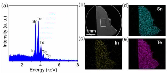 The EDS spectrum shown in Figure 2a was taken from the white dashed square area marked in Figure 2b, it is obvious that all three elements of In, Sn and Te were detected in the single crystal obtained. The actual compositions for all crystals are listed in Table 1. Note that the composition here is the average of the results measured at three different positions on the same single crystal. We can clearly see that the indium contents are slightly lower than the nominal contents, while the tin contents are slightly higher than the nominal. Combined with the SC transition observed in electrical transport measurement, which will be shown in the following part of the paper, we are sure that indium was effectively doped into SnTe. The composition checked at different positions on each single crystal was almost the same within the range of instrument error (1%), which means the elemental distribution is homogeneous in each crystal. This homogeneity was further confirmed by the elemental mapping, as shown in Figure 2c–e. We would like to point out that the indium content is sensitive to the growth temperature at the same growth: generally, the higher the growth temperature, the higher the indium content.
