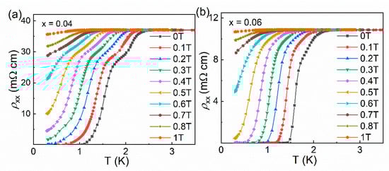 In order to check how the superconductivity in our crystals evolves under magnetic fields, we performed resistivity measurements under various magnetic fields for x = 0.04 and 0.06 crystals, as shown in Figure 3. It is very clear that Tc was suppressed gradually with the increase of magnetic fields and finally disappeared when the magnetic field reached 1 T.