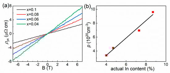 The magnetic field dependence of Hall resistivity, , was measured at 10 K for all indium doped crystals with field from −7 to 7 T, as shown in Figure 4a. All the (B) curves show a positive slope, indicating a hole-dominant carrier (p type) which is consistent with that reported by Novak. et al. [21]. The hole density p can be estimated in the following way: from the slope of the Hall resistivity versus the magnetic field B, we can obtain the Hall coefficient RH. Then, the nominal carrier density pH = 1/(eRH) was determined at 10 K. The actual hole density can be estimated by multiplying pH with a Hall factor r, which was explicated to be 0.6 for SnTe [21,32]. Finally, we obtained p via p = 0.6 pH and the results are listed in Table 1. The hole density increased almost linearly with the increase of actual indium content, as shown in Figure 4b, which is quite similar to that reported by Enrickson et al. [15] and Novak et al. [21].