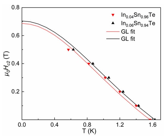 The upper critical field as a function of temperature, , is exhibited in Figure 5. By fitting the data with the Ginzburg-Landau (G–L) equation,, we can obtain the upper critical field at 0 K. The extracted are about 0.68 T and 0.71 T for x = 0.04 and 0.06, respectively. In general, data was well fitted with the G-L equation.