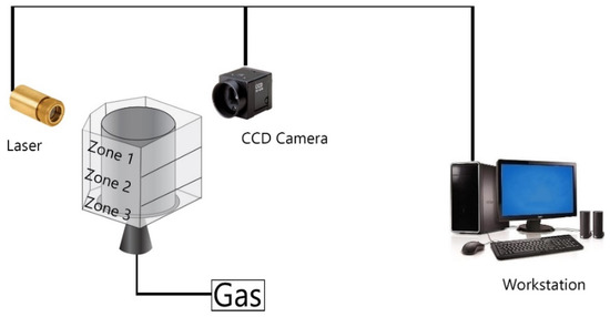 The particle image velocimetry (PIV, NEW Wave Solo 200XT, NewWaveTM Research Co., Ltd., Cambs, UK) was utilised to analyse images within the cold model study. The recording was conducted via a CCD camera (Dantec FlowSense 2E, Dantec Dynamics, Skovlunde, Denmark); the recording length in real-time was 15 s with a recording speed of 600 fps. The recorded images were processed with the image analysis software Stream Motion Olympus 1.9.4 (Olympus Soft Imaging Solutions GmbH, Hamburg, Germany), Dynamic Studio (Dantec Dynamics, Skovlunde, Denmark) and Tecplot 360 (Tecplot Inc., Regenstauf, Germany) in automatic and manual modes. Average values of the measured parameters, such as bubble size, bubble velocity, gas hold-up, expansion angle, spout height, and open eye area were determined from at least 100 images/bubble. During the measurement, the camera was focused on the centre of three different areas—top, middle, and bottom of the ladle (i.e., Zone 1, 2, 3). Approximately, these zones have the following dimensions in the axial direction of the water model: