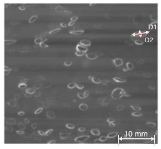 During the experiments, spherical, spheroid, and spherical-cap bubbles were detected. Each bubble had a different form; therefore, two different diameters (i.e., D1 and D2) were measured (see Figure 2). D1 is the largest diameter of the bubble, while D2 is the smallest. According to Equation (16):