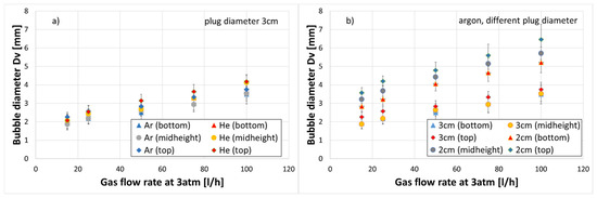 Figure 3 shows a dependence of the bubble equivalent diameter Dv on the gas flow rate, stirring gas (Figure 3a), and plug diameter (Figure 3b). By increasing the gas flow rate, the equivalent diameter increased for both argon and helium as well as for different plug diameters. The bubble equivalent diameter increased approximately linearly with an increase of a gas flow rate. It is also seen that the diameter of the helium bubbles was slightly larger—about 10% more—at gas flow rates higher than 50 L/h at 3 atm pressure. At low gas flow rates, this effect was not visible. The porous plug diameter had a stronger impact on the bubble equivalent diameter. When blowing with a 20 mm plug, bubbles were much larger than the ones with a 30 mm plug at the same flow rates and gas densities. An average value of the equivalent diameter was determined from a minimum of 100 pictures. The standard deviations were between 0.2 and 0.8 mm.