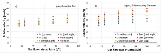 The rising velocities of the bubbles were lower immediately after the plug than at the top of the water model. This can be seen in Figure 4, where the bubble velocities are shown as a function of a distance from the plug, gas flow rate, stirring gas (Figure 4a) and plug diameter (Figure 4b). Increasing the plug diameter reduced the velocity of single bubbles. The registered standard deviations indicated good accuracy and reproducibility of the experiments.