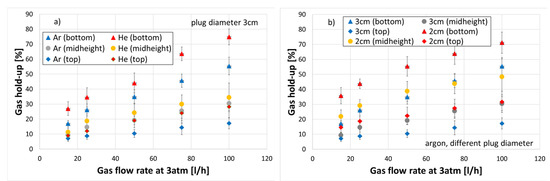 Figure 5 illustrates a relationship between the axial gas hold-up in a bubble plume and gas flow rate for the three different water model zones with stirring gases argon and helium (Figure 5a) as well as with a nozzle of 20 and 30 mm (Figure 5b). The highest gas quantity appeared shortly after bubbles leave the nozzle. It then decreased approximately linearly with a height of the vessel. The gas hold-up increased by increasing the gas flow rate. Herewith, the axial gas hold-up was higher for helium as a stirring gas than argon within all conducted experiments. Moreover, the higher axial gas hold-up was detected for the 20 mm porous plug in comparison to 30 mm.