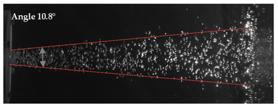 The expansion angle of the bubble swarm appeared to depend on the volume of gas bubbles and nozzle distance, Figure 6. When measuring the angle, a plume area with a minimum of 95% of all bubbles was taken automatically by image analysis software. The individual bubbles out of the plume were not taken into account. The mean value of the expansion angle was calculated from up to 100 measured values. Due to the symmetry of the bubble swarm, the half-expansion angle was utilised for representation (see Figure 7). Thereby, the half-expansion angle decreased with reducing the plug diameter. Meanwhile, the maximum value of the half-expansion angle was approx. 10.4° for a case of the 2 cm nozzle diameter, gas flow rate of 100 L/h, and 3 atm pressure. The linear dependence between the expansion angle and gas flow rate remained after a change of the nozzle diameter from 30 to 20 mm. The tests with helium resulted in the same linear relationship with a gas flow rate (see Figure 7). Stirring with helium compared to argon caused the bubble swarm to spread at a lower angle. The gas introduction with helium covered values between 6.5 and 10.5° for the flushing range used.