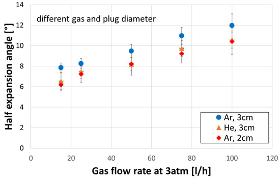 Half-expansion angle as a function of gas flow rate for different plug diameters and stirring gas types.