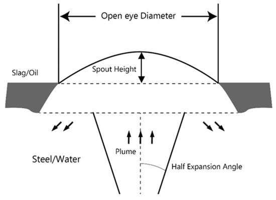 The expansion angle of the bubble plume increased with the gas flow rate, but it also demonstrated a dependence on the plug diameter (Figure 7). As the diameter of the porous plug decreased, the expansion angle decreased, as shown by an area of the open eye (see Figure 11). The velocity of helium bubbles was small, so the helium bubble plume expanded slightly leading to a lower half-expansion angle of the helium plume under the same conditions as the argon plume (see Figure 7). This, however, does not match the results from [31], where the helium/water jet expanded more rapidly than air/water jets.