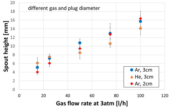 The spout height (see Figure 8) increased linearly with the argon flow rate (see Figure 9). The variation of nozzle diameters regarding the spout height led to the conditions illustrated in Figure 9. It can be assumed that the nozzle diameter had a negligible influence on the spout height. By stirring with helium instead of argon, the values of spout height were in the range of standard deviation. A clear dependence of the open eye height on the gas type was indistinguishable.