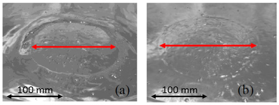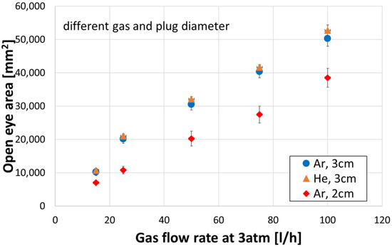 A layer of oil on a surface of the water bath can make contours of the open eye clearer (see Figure 10). However, to avoid an influence of the oil layer on geometry of the open eye, all investigations in this work were carried out without an oil layer. Figure 11 illustrates the relationship between the open eye area and gas flow rate. The open eye increased from about 10,000 mm2 at 15 L/h continuously up to about 50,000 mm2 at 100 L/h. Since the open eye was circular in the images, it corresponded to a diameter of 113 and 252 mm. The low standard deviations of about 500 to 3000 mm2 demonstrated the good reproducibility of the results. The plug diameter also influenced the open eye area. With a reduction in plug diameter, the open eye decreased. The linear relationship between the open eye and gas flow rate was maintained. By stirring with helium, there was no clear difference to the values obtained with argon by using the same plug diameter. All values were in the range of standard deviation.