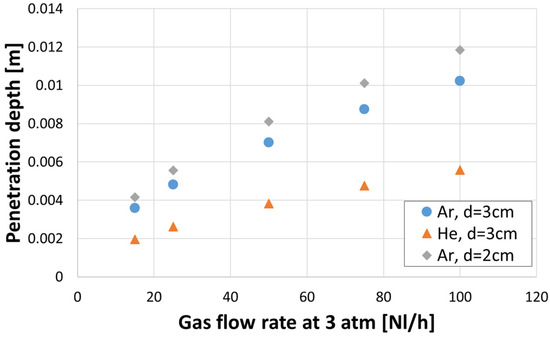 Penetration depth as a function of stirring gas, plug diameter, and gas flow rate calculated with Equation (18).