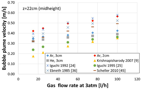 - The velocities of gas bubbles in the plume measured in this work were compared to results in the literature, which were obtained on water models using nozzles of a few millimetres size and various similarity criteria. Unfortunately, the studies utilised for comparison have not considered the gas density or nozzle diameter and provided quite variable predictions.