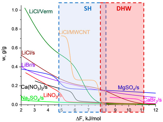 Figure 2 shows different equilibrium curves, reported in the literature for composite sorbents using various hygroscopic salts embedded in porous structures. Furthermore, the ranges of ΔF corresponding to charging–discharging operation of STES for SH and DHW are represented. For the SH case, it is clear that, even if slightly varying with the different matrixes, the hygroscopic salt showing the most promising features is the LiCl, that should be able to adsorb more than 0.4 g/g of water under the defined operating conditions. Given the high discharging and charging temperature, the DHW storage operation is shifted towards higher ΔF range. Under these operating conditions, LiBr that is characterized by a stronger affinity to water vapor and sorbs at a higher ΔF-values is selected as the best option, which could enable exchanging more than 0.1 g/g. Furthermore, the sorption properties of the composites can be managed by a proper selection of the salt content, thus enhancing their sorption capacity [14].