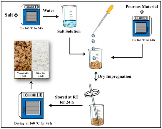 For the synthesis of the composite sorbents, the dry impregnation technique was applied [38,39]. The main phases of the process are schematically represented in Figure 3:
