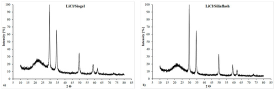 As reference case, Figure 6a,b reports the XRD patters obtained at 25 °C of two samples based on Siogel and LiCl (Figure 6a) and LiBr (Figure 6b).