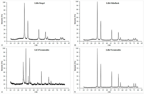 XRD patters of composite sorbents at 90 °C: (a) LiCl/Siogell; (b) LiCl/Siliaflash; (c) LiBr/Siogel; (d) LiBr/Siliaflash; (e) LiCl/Vermiculite; (f) LiBr/Vermiculite.