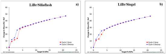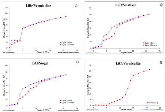 The isotherms of the composites employing LiBr are shifted toward a lower humidity that indicates its stronger affinity to water. Again, the step attributed to the formation of LiBr·H2O is observed, which is followed by the smooth uptake growth corresponding to the water absorption by LiBr aqueous solution inside pores. From the obtained isotherms it is easy to observe that the behavior of composite sorbents depends on the matrix and on the embedded salt. Generally, the sorbents made by silica gel matrices show smoother de/adsorption de/increment of the uptake (Figure 9a,b,d,e), while the sorbents based on vermiculite present distinct steps of de/adsorption (Figure 9c–f). This difference is probably due to a larger size of the salt crystals inside pores.