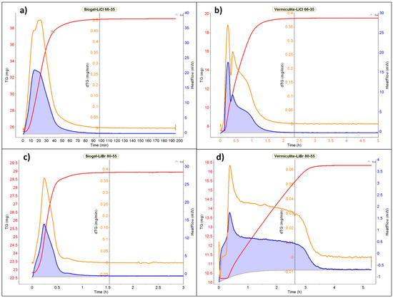 TG/DSC evolutions measured over LiCl-based samples, with siogel (a) and vermiculite (b) matrix respectively, under the temperature drop 66–35 °C and LiBr-based samples, with siogel (c) and vermiculite (d) matrix respectively, under the temperature drop 80–55 °C, at 8.7 mbar of water vapor pressure, corresponding to 5 °C of evaporation temperature.