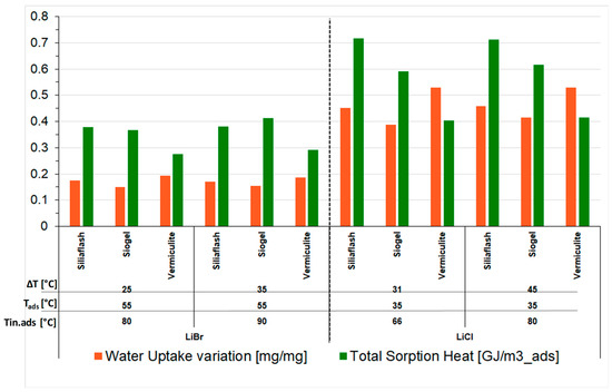 As expected, both water uptake variation and sorption heat obtained for DHW operation are much smaller than the ones measured for SH applications. Interestingly, the obtained results are almost unaffected by the initial adsorption temperatures applied. This means that, at the investigated water vapor pressure, the composite sorbents already reached their minimum adsorption capacity at the lowest starting adsorption temperature, namely 66 °C for SH and 80 °C for DHW. Looking at the achieved results, composite sorbents based on vermiculite achieve the highest water uptake variation, namely about 0.18 g/g for DHW and 0.52 g/g for SH. The silica gel-based ones show, on average, a lower water exchange capacity ranging between 15% (LiBr composites) and 25% (LiCl composites) of the ones obtained with the vermiculite-based composites. This is due to the higher amount of salt confined in the pores of the vermiculite. Specifically, these values are in line with the salt content of the synthesized samples. Indeed, the LiCl embedded in the silica gel samples is roughly 30% lower than content embedded in the vermiculite, while for the LiBr, this reduction is of about 20%. This confirms that the salt represents the active part of the composite, which mainly sorbs water vapor.