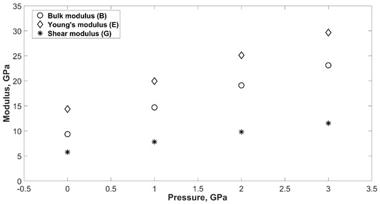 To understand the effect of applied pressure on the mechanical properties of sH gas hydrates, the empty, Xe-NH, and CO2-NH sH gas hydrate structures were investigated under multiple pressures. The pressure-dependent bulk (B), shear (G), and Young’s (E) moduli of CO2-NH sH gas hydrate are presented in Figure 2 and those of empty and Xe-NH sH gas hydrates are available in Table 4. In general, the moduli of filled sH gas hydrates increase with increased pressure, however, the chemistry of guests play a role in the rate of change of moduli with pressure. The moduli of sH gas hydrates are affected by the hydrate’s hydrogen bonds and its strength that affects the structure’s compressibility and elasticity. The increase in bulk modulus with compression of empty, Xe-NH, and CO2-NH sH gas hydrates can be linked to the strengthened hydrogen bonds under pressure which was discussed in our previous work [7]. The rate of change of bulk modulus of sH gas hydrates with pressure is comparable to that of the pressure-dependent isothermal bulk modulus of ice (Ih) reported by Gagnon et al. [36] at −35.5 °C. Manakov et al. [62] computed the pressure-dependent bulk modulus from experimentally obtained pressure-volume data of xenon sI, ethane sI, and THF-xenon sII gas hydrates. Their results show the increase in bulk modulus of the three gas hydrates with increased pressure which agrees with this work’s findings of sH gas hydrate pressure-dependent bulk modulus at 0 K.