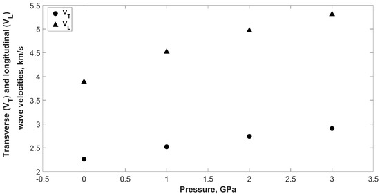 The detection of gas hydrates’ location requires proper measurements of wave velocities or elastic speeds of sound. The importance of obtaining the longitudinal (VL) and transverse (VT) wave velocities is clear in the relationship between those velocities and other critical elastic properties of a material. The longitudinal (VL) and transverse (VT) wave velocities of different sH gas hydrate structures were computed from first principles at 0 GPa and are presented in our previous work [3]. The pressure-dependency of those velocities for empty, Xe-NH, and CO2-NH sH gas hydrates is discussed here. Table 6 has VT and VL of empty and Xe-NH sH gas hydrates at three pressure points and 0 K and Figure 4 shows the pressure-dependent velocities of CO2-NH sH gas hydrate. For filled sH gas hydrates (Xe-NH, CO2-NH) there is a clear increase of both velocities with increased pressure. However, the longitudinal wave velocity (VL) experiences a larger rate of change with pressure compared to the transverse wave velocity (VT). The transverse wave velocity of empty sH gas hydrate is weakly dependent on pressure and experience a slight decrease unlike that of filled sH gas hydrates. This is due to the slight decrease of empty sH gas hydrate’s shear modulus and its density increase with compression. Empty sH gas hydrate has the highest longitudinal wave velocity among the other systems presented here at all pressures. This can be explained by the higher density of filled sH gas hydrates compared to empty sH. Transverse wave velocity depends on shear modulus and density, while longitudinal wave velocity depends on Young’s modulus (and hence bulk and shear moduli), Poisson’s ratio, and density. The pressure-dependence of those velocities is basically understood through the pressure-dependence of Poisson’s ratio, density, and shear and bulk moduli.
