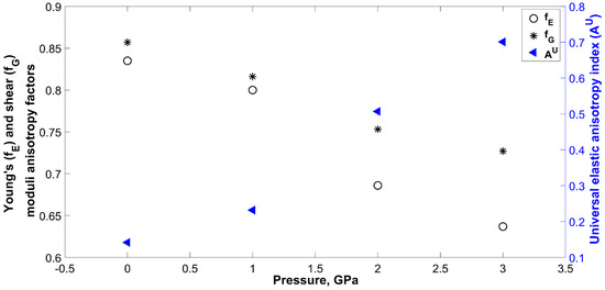 Pressure-dependent anisotropy of CO2-NH sH gas hydrate presented by the universal elastic anisotropy index (AU) and Young’s (fE) and shear (fG) moduli anisotropy factors at 0 K.